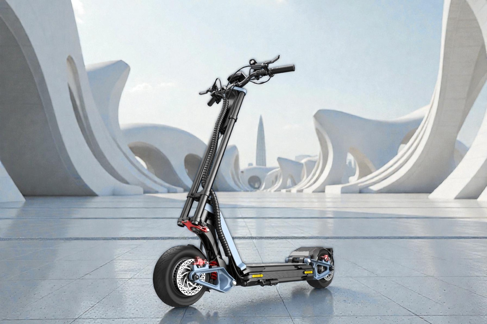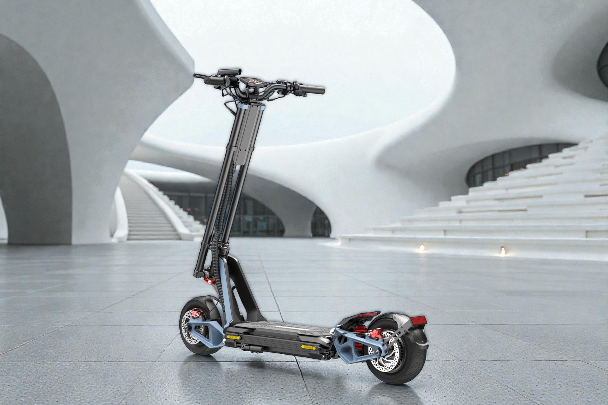 La Inmotion RS Casper n’est pas une simple trottinette, c’est une vitrine technologique. Édition spéciale du vaisseau amiral Inmotion RS, ce modèle se distingue par sa livrée unique (souvent Bleu/Blanc ou « Polar ») et embarque la configuration la plus musclée du catalogue. Son atout maître ? Un système de géométrie variable breveté qui permet de transformer le châssis pour passer du confort d’un SUV à l’aérodynamisme d’une F1.