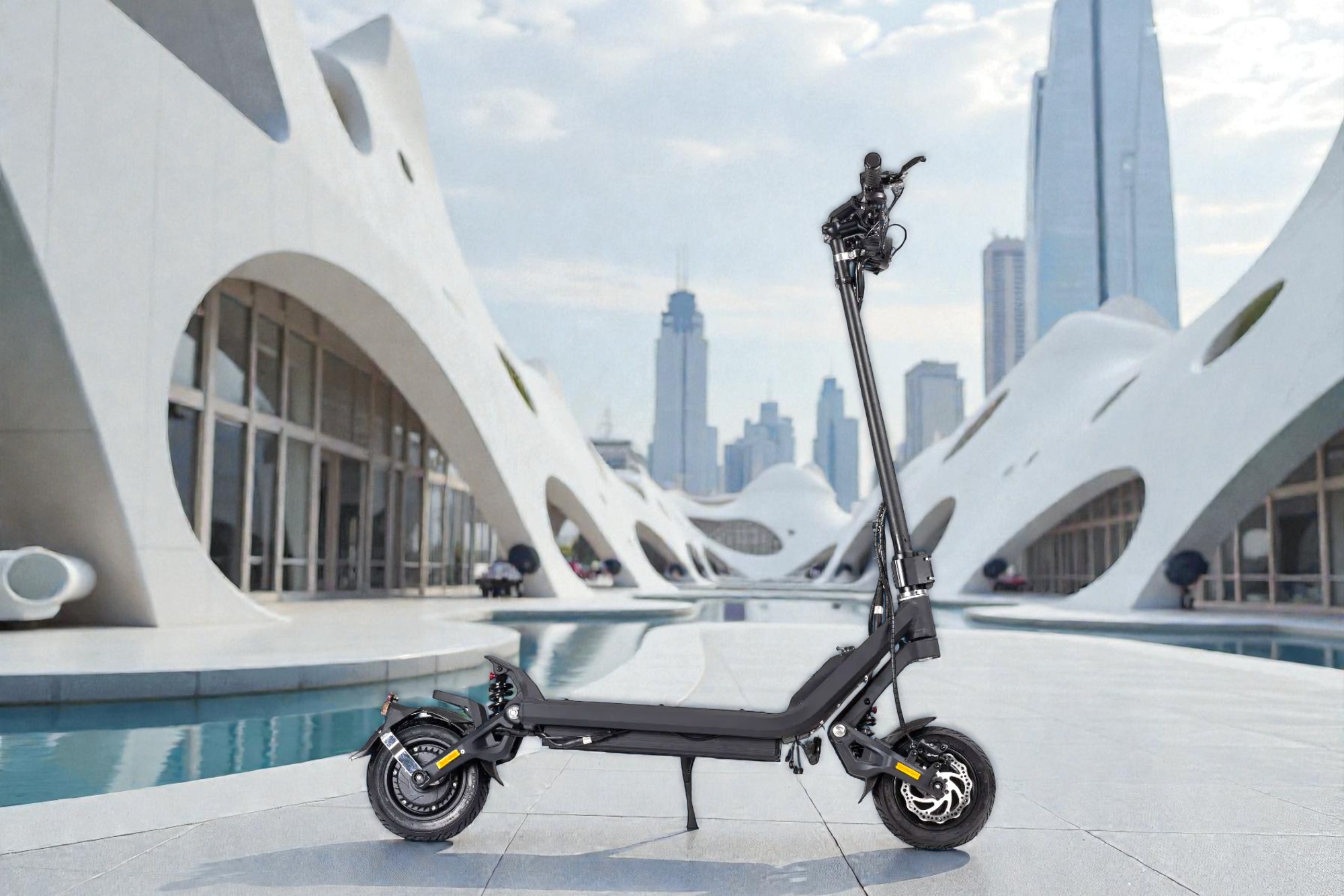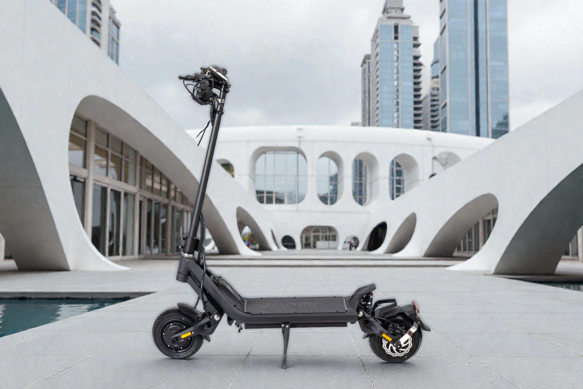 Châssis Monobloc en Aluminium : Contrairement à la plupart des trottinettes dont la colonne se visse sur le deck (source de jeu), la Klima est soudée d’une pièce. Zéro jeu dans la direction, jamais.